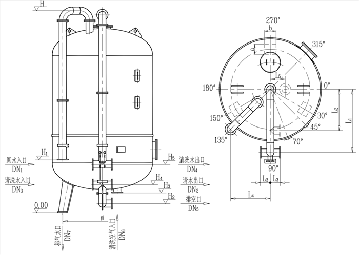 設(shè)備內(nèi)部設(shè)有纖維濾元的密度調(diào)節(jié)裝置,設(shè)備運行時過濾介質(zhì)從上到下通過纖維濾層,此時纖維密度調(diào)節(jié)裝置推動活動板下壓,濾層密度逐漸增大,濾層空隙減小,過濾精度增加,實現(xiàn)深度過濾。反洗再生時,清洗水從下到上通過濾層,纖維過濾器活動板提升,濾層纖維放松孔隙增大,同時汽水混合物對纖維束濾料進行清洗。濾層加壓過濾和放松清洗過程不需要其他動力裝置提供動力,均通過水力自動實現(xiàn)。