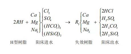 當(dāng)水通過陽離子交換器(陽床樹脂)時(shí),水中的各種陽離子被樹脂中的H+,Na+離子交換后留在樹脂上,而H+,Na+離子則到了水中,鈉基樹脂一般用在軟化水處理中,鈉離子置換掉水中的鈣鎂離子,降低水中的鈣鎂硬度。氫基樹脂陽床離子交換器一般和陰床離子交換器共同使用,或者使用在混床離子交換器中。水中的陽離子被H+置換后,陽床出水含有H2SO4,、HCl等強(qiáng)酸,一級H2CO3,H2SiO3等弱酸,因此呈酸性,這些水進(jìn)入到陰離子交換器后,水中的各種陰離子被OH+離子置換,OH+離子被置換到水中,和H+離子結(jié)合成水,反應(yīng)式如下: