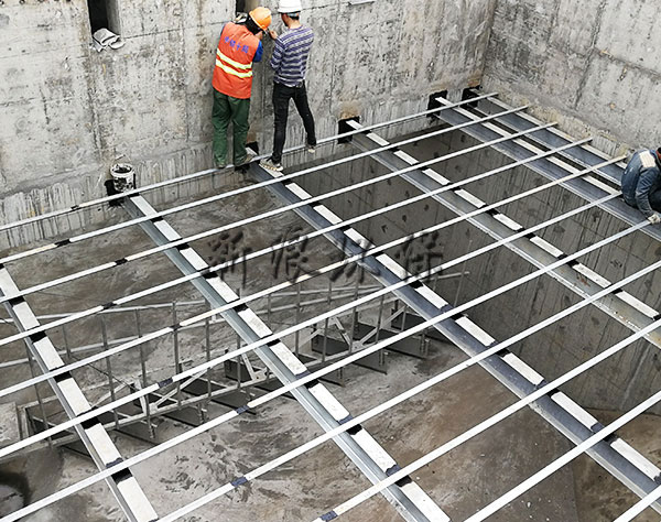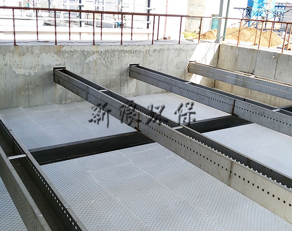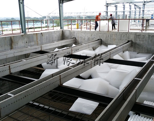 由于斜管填料比重為0.92略小于水,應(yīng)用φ10mm的螺紋鋼或圓鋼拉筋固定在填料上方,防止其松動上浮。